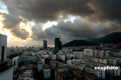 8月20日清晨,连云港市受台风“圣帕”外围云系和热带低压环流影响,整个城市、高山、港口上空乌云突变,黛青色的浓云飞舞,市景、港口、大海与乌云交融,犹如一幅水墨画。中新社发 王春 摄