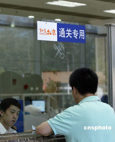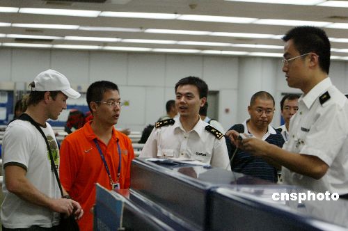 八月二十一日,参加“好运北京”系列赛事的各国运动员在赛事志愿者的引导下,非常迅速的通过了北京首都机场海关为他们设立的专用通道,这只是北京海关为此项赛事进行全力保障的一个方面。除此之外,货管、快件等诸多方面也同时做好了充分的保障。从一月至今,海关共计验放奥运及测试赛物资一百零三批,总价值约一千零二十一万美元,旅检现场验放来自五十个国家和地区的运动员、教练员等一千零一十九名。中新社发 任海霞 摄