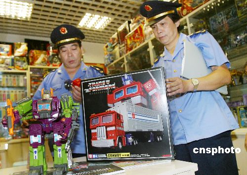 随着电影《变形金刚》的热播,玩具收藏的热度也随之升高,由此带来的玩具质量投诉也有所增加。8月24日,北京西城工商分局对辖区内的玩具模型店进行了检查,内容包括商家进货检查验收制度执行情况,商品标注情况及国家相关强制标准执行情况等。在西单新一代商城,西城工商分局的工作人员当场查出十余件无中文标识的变形金刚的模型玩具,勒令其全部下架。并且提醒消费者,如果需要购买这些模型玩具,要看清是否具有无中文标识以及商品标注情况,以防受骗上当。中新社发 闻昭 摄
