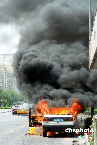 8月25日11点40分左右,一辆轿车在北京长安街上行驶至永安里路口西(长安街路北侧)时突然起火,司机用灭火器自救未能奏效,猛烈燃烧的轿车黑烟滚滚,随后引发油箱爆炸,所幸未造成人员伤亡。10分钟后,消防队员赶到现场并将大火扑灭。中新社发 何野萍 摄