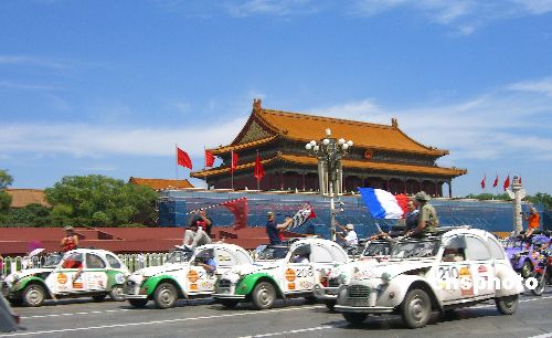 八月二十九日,一支由多国老爷车爱好者组成甲壳虫老爷车队浩浩荡荡行进在北京长安街上,途经天安门广场时,成为一道独特的风景。中新社发 杨可佳 摄