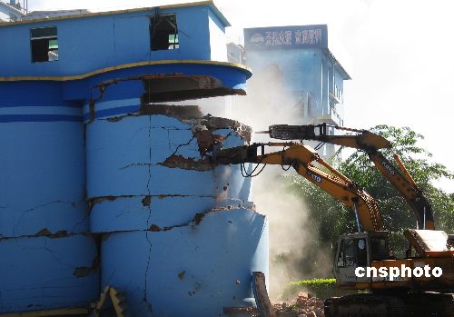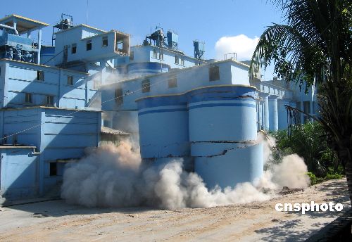 为保护得天独厚的自然环境,建设“国际热带滨海旅游城市”,八月三十日,海南省三亚市开始拆除全市最大的工业企业三亚华盛天涯水泥厂。二00六年,三亚华盛天涯水泥厂二氧化硫排放量、工业粉尘排放量、烟尘排放量分别占全市工业排放量的百分之九十七、百分之九十三点七、百分之八十一,是三亚大气质量的“头号杀手”。中新社发 尹海明 摄