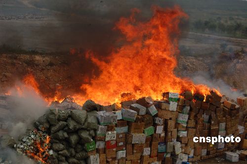 2007年8月29日下午,山东潍坊市公开销毁了180余万元假劣、不合格药品。据介绍,潍坊市食品药品监督管理局从去年开展整顿和规范药品市场秩序专项活动以来,全市出动检查人员2万2千余人,检查涉药单位1万8千余家,以确保市民吃上安全有效的“放心药品”。中新社发 贾春毅 摄