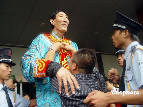 八月三十一日上午,身高二点三六一米、中国自然生长第一高人鲍喜顺携新婚妻子亮相郑州某住交会现场,众多市民慕名前来一睹高人风采。图为工作人员为鲍喜顺“更衣”。中新社发 李志全 摄
