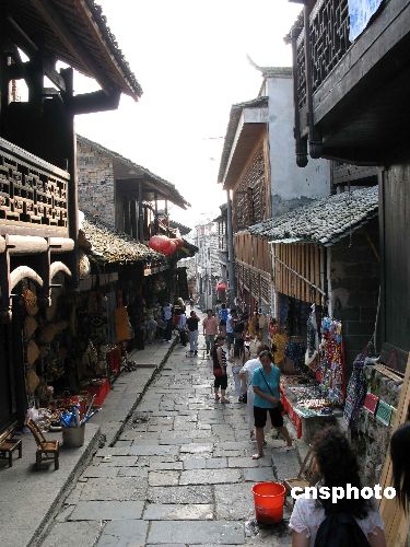 湖南湘西土司王的古都——永顺县王村,距今已有二千多年的历史。据《永顺县志》记载,王村在秦汉时期为一座山城,古称酉阳,是湘西土司王的古都,也曾是湘西文化、政治、经济中心。尽管历时千年,古镇原始风貌至今保存基本完好。一九八七年,因中国著名导演谢晋在此拍摄电影《芙蓉镇》,千年古镇王村一改往昔“养在深闺人未知”的境况而扬名海内外,逐渐成为海内外专家学者了解、研究土家族民俗风情的重要窗口。如今,这里更成为海内外人士争相游览的古城镇之一。中新社发 任海霞 摄