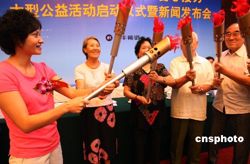 9月5日,“共享健康爱心接力”骏丰频谱公益活动启动仪式在北京钓鱼台国宾馆举行,是次活动将在中国内地的广东、北京、上海、辽宁、山东、湖南、河北、广西等城市举行,活动旨在弘扬中华民族敬老、爱老、助老的传统美德,为老年人送去温暖与爱心,呼吁全社会关爱老龄群体的健康。图为在启动仪式上奥运冠军高敏与七旬老人传递“爱心”接力火炬。中新社发 钱兴强 摄