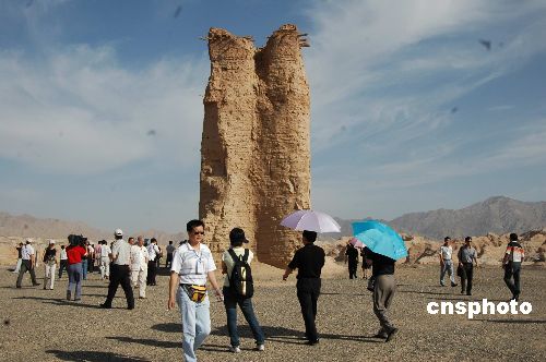 9月6日,古丝绸之路库车县境内,年代最早、保存最完好的汉代克孜尔尕哈烽火台游人如织。进入9月份以来,龟兹故地·石化新城---库车县各旅游景点日接待游客800余人,旅游进入高峰期。中新社发 陈鹏 摄