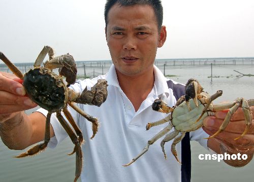 9月9日,阳澄湖蟹农展示刚刚试捕上来的阳澄湖大闸蟹。当日上午,苏州相城区阳澄湖镇的蟹农们,纷纷在自家的围网养殖区内提起完成最后一次脱壳的大闸蟹,察看其生长情况。他们欣喜地表示,今年的大闸蟹无论雌雄,每只都比去年重了半两左右,整体质量好过往年。再过一周,著名的阳澄湖清水大闸蟹就将开捕并大量上市。中新社发 邱勇 摄