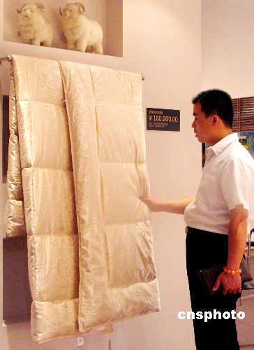 9月9日,在北京国际纺织博览会上,一家纺织企业展示一条顶级山羊绒被子标价高达18万元,令许多观众看后惊讶不已。中新社发 吴芒子 摄