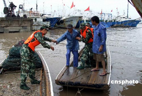 9月18日上午,浙江瑞安边防大队官兵劝说港内作业的小渔船上的4名渔民上岸。2007年第13号台风“韦帕”逼近,瑞安边防大队抗台应急小分队官兵深入沿海港口、滩涂一线,动员在海上作业的渔民和居住在工棚、简易房内的外来务工人员撤离到安全地带,并帮助他们一起转移物资和生活用品,预防超强台风“韦帕”的袭击。中新社发 陈孝和 摄