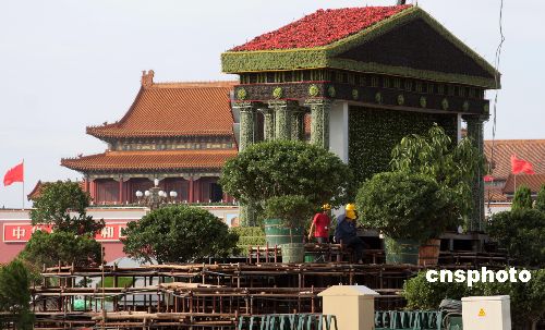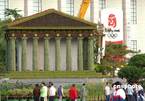 9月18日,天安门国庆花坛主体结构搭建完毕。今年国庆天安门花坛布置方案确定用花量达40万盆。国庆天安门共有四组花坛,广场中心摆放“万众一心”主题喷泉花坛,东侧花坛以奥运为主题,花坛中设计了雅典卫城、中国长城等景观,西侧的花坛主题为迎接十七大,花坛中设计了“天坛祈年殿”、嘉兴南湖游船等景观。