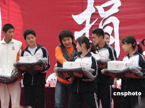 9月19日,参加“龙子心真情再现捐献”活动的联合国亲善大使、国际著名影星成龙来到山东省枣庄市市中区永安乡龙子心中学,为该校800多学生每人捐献了一双运动鞋、一件羽绒服及学习用品。中新社发 季龙 摄
