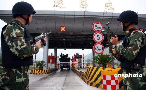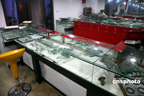 9月20日下午,浙江省龙泉市市区发生一起持枪抢劫案,一家金店被抢价值20余万元的金器。据目击者称,案发时,有4名嫌疑人驾驶一辆黑色桑塔纳轿车停在金店门口,其中两位蒙面男子下车走进金店砸碎柜台的玻璃进行抢劫,并开了一枪,但未伤人。案发后,当地组织武警、公安力量进行拦截和追捕。目前追捕行动还在进行中。中新社发 朱丽勇 摄