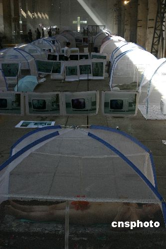 2007年9月23日,在北京左右艺术区“99个帐篷,99个梦想”的创作现场,海容天天展示了裸体行为艺术《莲》。通过由垃圾和混凝土筑成的台子、裸体的美女、焚香、莲花、帐篷等元素以及与观众的互动,行为艺术家表达了在钢筋水泥的“森林”里对自然和人性的呼唤。中新社发 鲁谷 摄