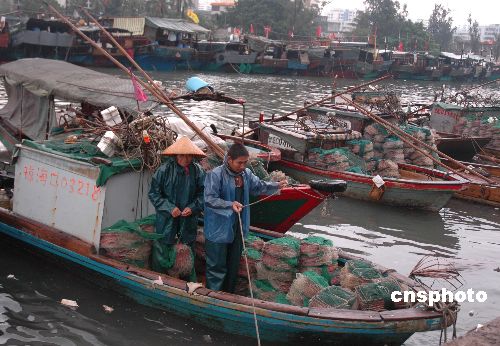 今年第十四号热带风暴“范斯高”九月二十四日中午十二时三十分在海南文昌昌洒镇登陆。风暴使琼州海峡风力阵风最高达到九级,当日早上七时始,琼州海峡全部停航,二百六十余所船舶回港停泊。中新社发 王辛莉 摄