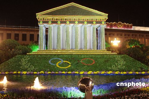 9月27日晚,向游人开放的北京天安门广场花坛夜景效果分外迷人,40万盆鲜花将天安门装点成花的海洋,而灯光照明更将这里变成了璀璨的天地。中新社发 吴芒子 摄