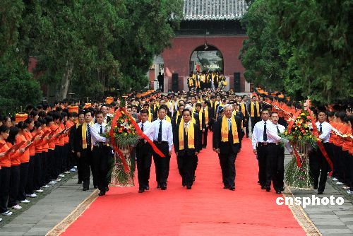 9月28日,2007年祭孔大典在孔子故里曲阜孔庙举行,全国政协副主席罗豪才、中共山东省委书记李建国率队祭孔,中共山东省委副书记、代省长姜大明恭读祭文。大典同时公布了征集到的献给北京奥运中的《论语》五句话。 中新社发 周青先 摄