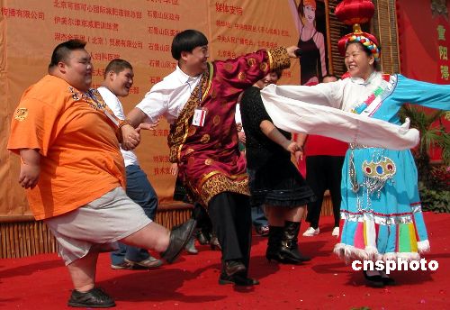 九月三十日上午,在京西的八大处公园内,一场别开生面的“中国魅力胖人比赛”在这里举行,来自中国各地的“重量级选手”齐聚北京,展示才华。据知,活动将持续至十月五日,有来自全国各地的近二百名胖友报名参加了这一免费的活动,其中最远的来自新疆和西藏,最重的胖友体重达到二百四十千克。图为活动现场,胖人们正在舞台上快乐地展示自己。中新社发 许可新 摄