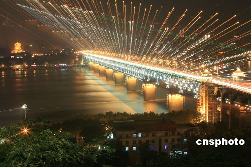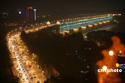 2007年9月30日,彩色节能灯将武汉长江大桥装饰一新,成为国庆节武汉市夜幕下一道亮丽风景。武汉长江大桥位于武汉市汉阳龟山和武昌蛇山之间,于1955年9月开始兴建,1957年10月6日通车,是我国第一座铁路、公路两用桥,全桥总长1670米,其中正桥1156米,北岸引桥303米,南岸引桥211米。建成50年来,成为连接我国南北的大动脉。中新社发 宋建春 摄