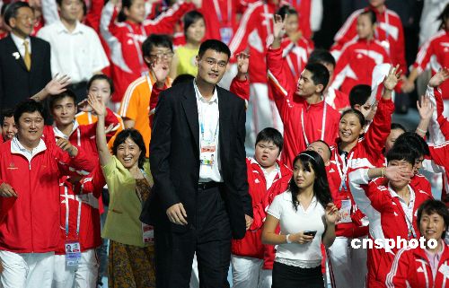 10月2日晚,2007年世界夏季特殊奥林匹克运动会在上海开幕,特奥全球形象大使姚明应邀出席了本届特奥会开幕式。图为姚明与中国特奥运动员一同入场。中新社发 汤彦俊 摄
