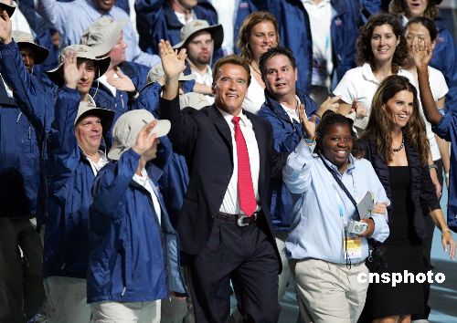 10月2日晚,2007年世界夏季特殊奥林匹克运动会在上海开幕。美国加州州长阿诺·施瓦辛格(图前排左二)携妻子玛丽亚·施莱佛(图右一)与美国特奥代表团一起参加特奥会开幕式。中新社发 汤彦俊 摄