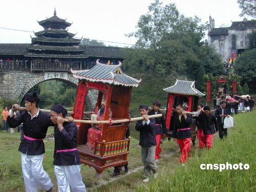 10月3日,广西三江侗族自治县和里村举行传统民族民间庙会活动,吸引游客前来观看。此次庙会通过化妆表演,运用艺术造型的手法,把过去的社会历史现象,用神话传说般的意境再现于现实生活。图为庙会的巡街表演。中新社发 曹伟军 周潇男 摄