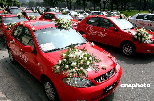“十一”黄金周,上海再现结婚潮,据有关部门统计,今年至少有3万对新人在“十一”黄金周期间举行婚礼。图为扎堆的婚车成为上海街头一景。中新社发 汤彦俊 摄