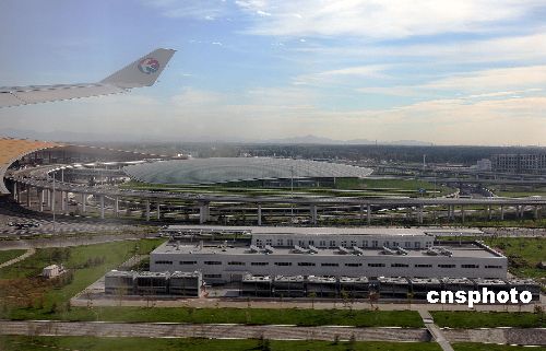 10月8日上午,经过几天阴雨后的北京秋高气爽,为缓解北京空港的严重拥堵、迎接北京奥运会,新建的首都机场新航站楼与配套的轻轨、高速公路、第三条跑道等工程呈现雏形。中新社发 任晨鸣 摄
