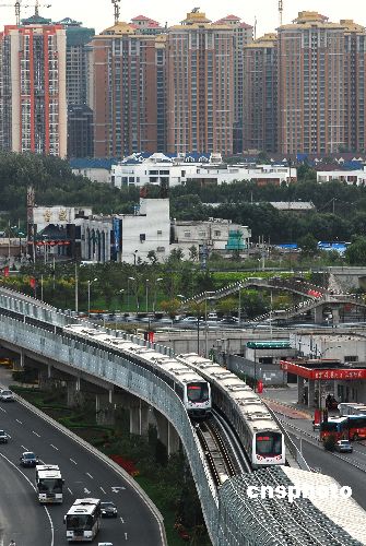10月8日是十一长假结束后的第一个上班日,北京地铁5号线首遇客流高峰。地铁部门预计当日5号线客流人数达到39.6万人次。其中,据地铁运营公司初步统计,仅当日早高峰,换乘5号线的乘客已达到5.7万人。图为两辆5号线列车在北苑北站附近错车。中新社发 李学仕 摄