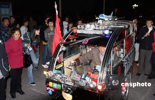 10月9日晚,来自北京东城区的雷老先生,开着自己装饰的三轮摩托车行驶在长安街上。彩灯闪烁、劲歌飞扬,一路上吸引了不少行人。中新社发 郑雄增 摄