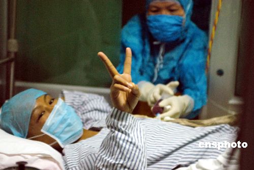 2007年10月10日凌晨,患血癌的蔡柳移植骨髓时打出胜利的手势。在海南海口市人民医院,患白血病的海口农家姑娘27岁的蔡柳顺利移植一名台湾男青年捐献的250毫升骨髓。据悉,这是台湾首次向海南省捐献并顺利移植给患者的造血干细胞。通过中华骨髓库找到与蔡柳配型的台湾男青年,此人在欧洲的岗位上返回台北,在9日捐献出造血干细胞(骨髓),后通过台北、香港、广州和海口四座城市的红十字志愿者和医务人员的“爱心大传递”,历时8个小时跨越台湾海峡、琼州海峡送达到海口市人民医院,连夜回输进蔡柳体内。蔡柳已顺利移植台湾捐献质量较高的造血干细胞,闯过了第一关后,目前各方面状况良好。中新社发 善平 摄