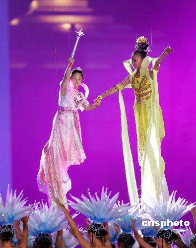 10月11日晚,在上海举行的2007年世界夏季特殊奥林匹克运动会闭幕式上,来自北京的智障女孩高清瑜在现场观众的见证下,终于飞上了美丽的夜空,实现了“飞天梦想”。中新社发 汤彦俊 摄