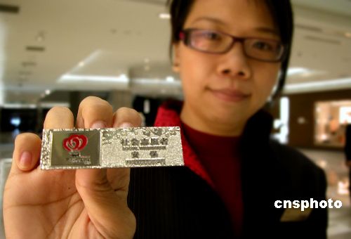 十月十二日上午,北京警方在城东的新光百货商场内举行“大中型商市场奥运社会(安保)志愿者上岗仪式”,数十名来自市区重点商场的保卫人员代表佩戴上“奥运社会志愿者-安保”标牌。这是北京奥运社会志愿者标牌首度亮相。图为一名商场奥运社会安保志愿者向记者展示该标牌。中新社发 许可新 摄