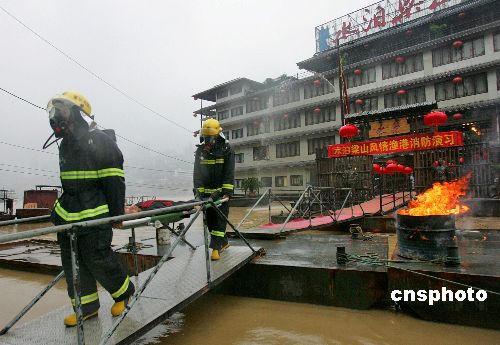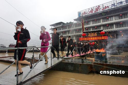 10月12日,重庆水上公安消防支队举行大型餐饮娱乐船火灾疏散演习。中新社发 郭晋嘉 摄