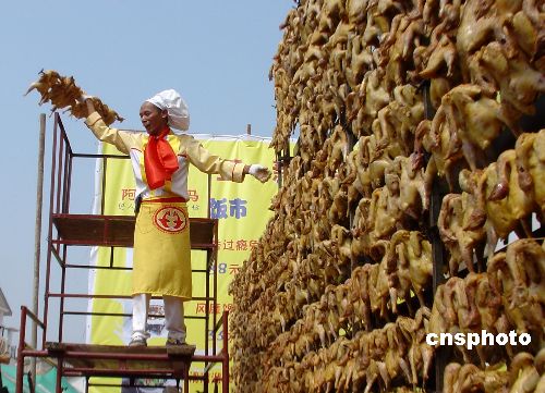 10月19日,在广西南宁举行的第17届中国厨师节暨东南亚国际旅游美食节上,广西厨师阿炳师傅一人同时烧烤2008只鸡冲刺吉尼斯世界记录,以此举迎接2008年奥运会在北京举行。中新社发 杨志雄 摄