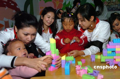 10月24日,“玺萌杯”第57届世界小姐总决赛中国赛区参赛佳丽,来到北京丰台区儿童福利院,把她们的笑容和爱心带给这里的孩子们。大赛赞助商“玺萌”公司向福利院捐赠了十万元资金。中新社发 樊建恩 摄