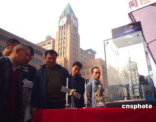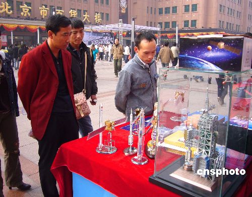 10月25日,漂亮逼真的“嫦娥一号”模型在北京王府井大街亮相,吸引了过往行人的目光。中新社发 玉龙 摄