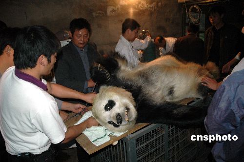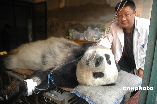 10月25日下午,大熊猫“师师”的体温已由前几天39.5度高烧降为38.3度低烧。大熊猫“师师”9月26日从四川搬到安徽淮南龙湖公园新家,随后发烧并连续数日拒绝进食。从10月22日开始,该市第一人民医院与四川卧龙大熊猫研究中心医生联手为“师师”治病,目前炎症已得到控制,病情有所好转。中新社发 柳青 摄