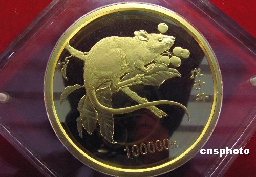 10月26日,由中国金币总公司等单位主办的“2007北京国际钱币博览会”在北京中国国际贸易中心开幕。博览会展出了中国人民银行于2007年10月23日发行的2008中国戊子(鼠)年金银纪念币一套。其中10公斤(鼠)圆形金质纪念币,含纯金10公斤,直径180毫米,面额100000元,成色99.9%,最大发行量仅仅18枚。据介绍,这枚10公斤金币售价远远高于面值。中新社发 邹宪 摄