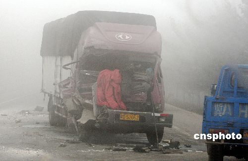 10月26日上午,罕见的秋季大雾弥漫河北省全景,高速公路全线封闭;宁晋县附近狭窄的乡间公路上两辆货运卡车在能见度不足20米的恶劣条件下争道相撞,造成人员物资严重损失。每年秋末冬初,中国北方、特别是华北平原一带经常会出现大雾天气。中新社发 任晨鸣 摄
