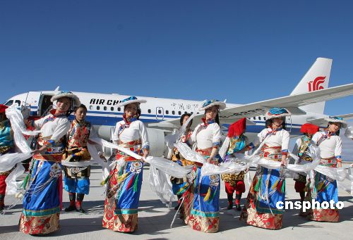 10月28日上午9点零5分,国航西南分公司B6238号空客A319高原飞机,展翅飞越海拔7556米的贡嘎雪山,平稳降落在世界第二海拔高度的康定机场。当地藏族民众在机坪跳起欢快的舞蹈,迎接国航“金凤”平稳降落。中新社发 易世忠 摄