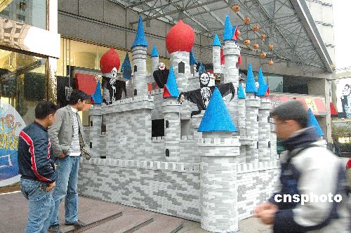 10月30日,两座“鬼堡”出现在杭州一商店广场。随着“万圣节”到来,杭州部分商家用各种形式的“鬼节”造型吸引顾客,抓住商机赚钱。中新社发 引炜 摄