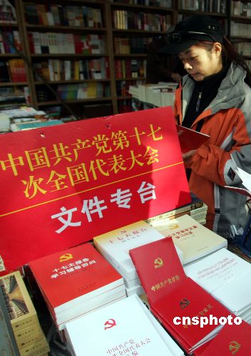 十一月二日,一年一度的北京秋季书市拉开帷幕。来自中国书店等五百余家参展商为广大读者奉献上了二十余万种图书“大餐”。中国青海热贡艺术展也首次亮相书市。在书市的首日,有关十七大的图书也成为热销图书之一。中新社发 任海霞 摄