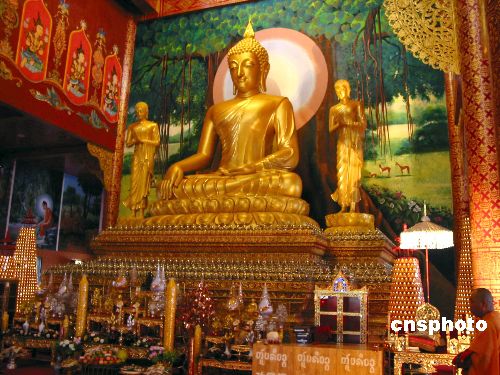 十一月三日上午,来自中国以及东南亚各国的一百零八位佛教界高僧大德,在位于西双版纳州景洪市,共同为新近落成的中国最大的南传佛教寺院勐泐大佛寺开光,近万名中外宾客和信众前往观礼。中新社发 甘娜 摄