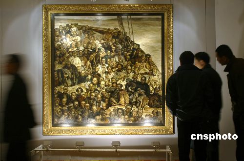 十一月四日,在嘉德2007秋季拍卖会预展上,观众正在观摩中国画家程丛林的油画《华工船》。该作品以十九世纪华工背井离乡、漂洋过海的血泪史为题材,是程丛林的代表作之一。该作品将于11月6日被拍卖,该作品估价超过2000万元人民币。中新社发 张炜 摄