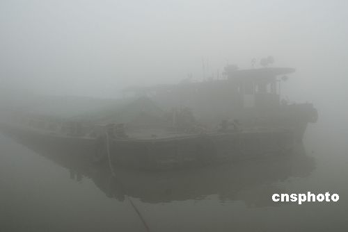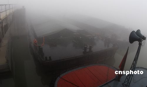 11月7日晨,一船队因浓雾弥漫无法航行。当日,大运河山东台儿庄航段浓雾弥漫,能见度不足20米,万年船闸和台儿庄船闸从早晨开始全线停止放船。停航造成至少近300艘船只短暂滞留,浓雾给船队通航和船民生活带来不便。中新社发 高启民 摄