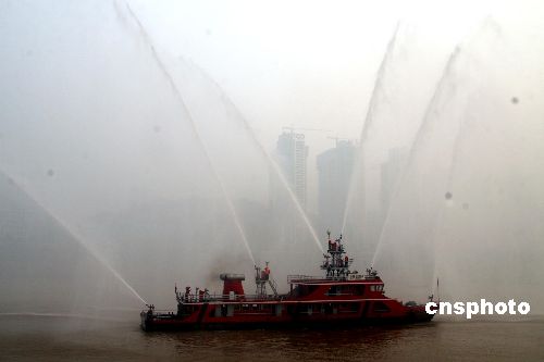 11月8日,重庆市水警总队和重庆市水上消防支队联合举办“生命至上、平安和谐”大型消防安全宣传活动,旨在进一步唤起当地民众参与消防工作的热情,增强民众对消防工作的参与度。图为重庆水上消防战斗艇进行射水表演。中新社发 郭晋嘉 摄