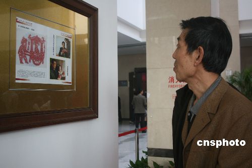 2007年2月17日,农历年三十,胡锦涛总书记到甘肃定西市安定区大坪村看望慰问当地干部群众。在村民李彩家里,总书记问年景、看水窖、察粮仓,同主人亲切拉家常。当总书记看到女主人在剪窗花时,也兴致勃勃地拿起剪刀,剪起窗花。总书记很快剪好一幅乡土气息浓郁的《回娘家》窗花。总书记的珍品佳作被李彩家珍藏。得知“八艺节”在武汉举行,经李彩家人同意,中国剪纸学会会员、定西市剪纸协会副会长刘伟将李彩大儿子李宏伟珍藏的胡锦涛总书记剪纸《回娘家》,用特快专递到武汉“第二届国际剪纸艺术展”组委会。中新社发 李长林 摄