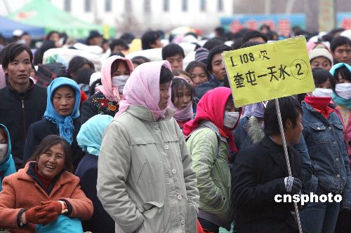 十一月十二日傍晚时分,在新疆奎屯市火车站站前广场上,大批来疆的采棉工排队等待登上回乡的列车。据该火车站工作人员介绍,当天有近万名采棉工由该站登上返乡的列车,预计到本月底该站将运送采棉工达十五万人。二00七年新疆棉花种植总面积达两千多万亩,总产量预计两百万吨,占中国棉花总量的三分之一。进入采棉期,来自各地的百万采棉工陆续进入新疆进行手工采棉作业,三个月左右的采棉期,每个人可挣到三千多元人民币,一些采棉能手可得到五千元人民币的报酬。中新社发 刘新 摄