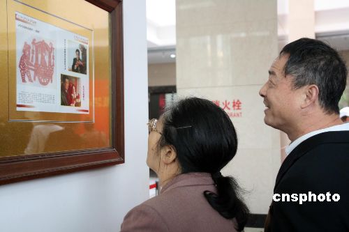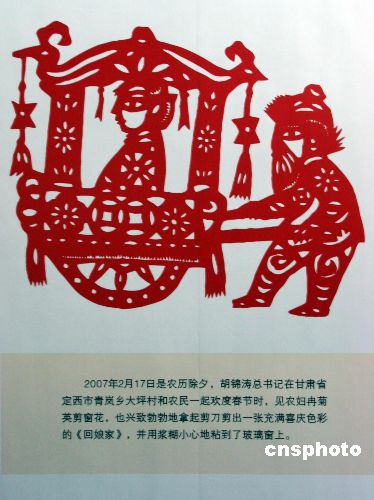 11月8日,观众正在欣赏胡锦涛总书记的剪纸作品《回娘家》。第二届全国剪纸艺术展在武汉湖北艺术馆展出,胡锦涛总书记的剪纸作品《回娘家》亮相艺术展。来自全国各地的观众一睹《回娘家》的风采,感受党和国家领导人心系人民群众,关心非物质文化遗产传统艺术的浓浓情怀。中新社发 李长林 摄